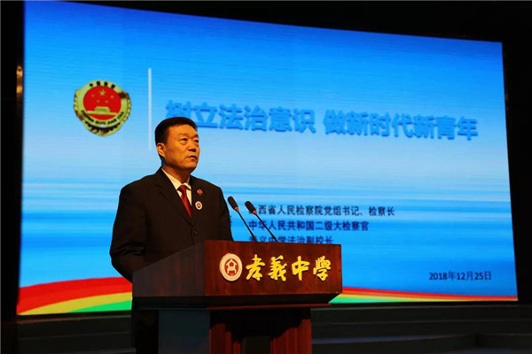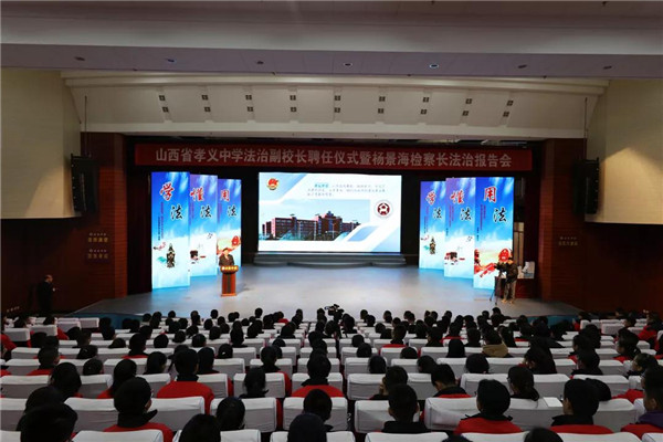 接过聘书,戴上校徽,杨景海检察长正式成为了孝义中学的一员。在向孝义中学赠送书籍后,杨检开讲了以“树立法治意识、做新时代新青年”为题的第一堂法治课。