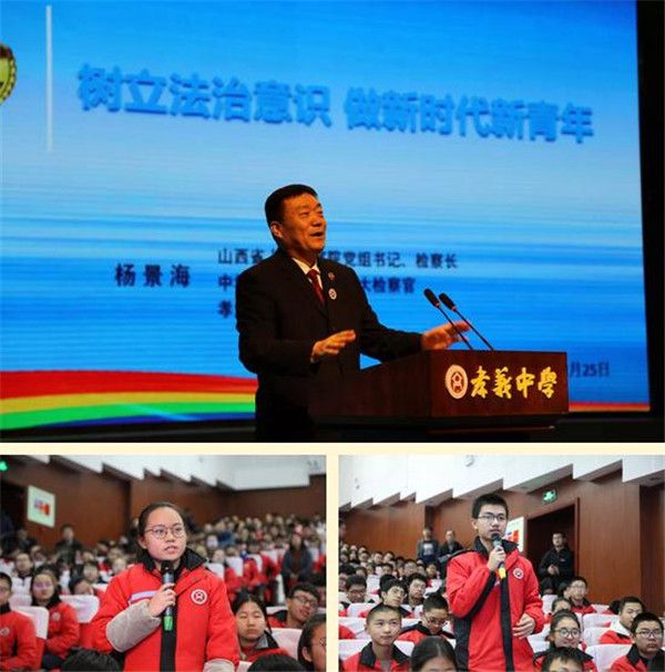 “同学们也许会问,一个省院的检察长、国家二级大检察官,怎么会选择到一个远离省城的孝义中学担任法治副校长呢?这是因为孝义地处吕梁革命老区、英雄腹地,有着光荣的革命传统,又有着悠久的感恩孝亲文化。在这片土地上孕育出无数的革命英雄,孕育了一个经济发展较快、最早进入百强县市的城市,孕育了一所有着六十多年历史、人才辈出的名校——孝义中学,在这片热土的滋养下,孝义检察工作突出、成绩斐然,未成年人检察工作更是走在全省前列,所以我将普法教育的地点定在了这里。”一段唠家常式的开场白拉近了杨景海检察长与同学们之间的距离,也让同学们认识了这位平和可亲的“杨校长”。