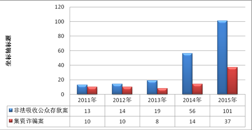 一是案件数量呈几何级上升趋势。2015年,非法金融活动犯罪加剧,特别是非法集资案件连续四年出现增长,近二年,非法集资案件数量更是几何级增长。(2011年至2015年非法集资犯罪案件数量见图4)。