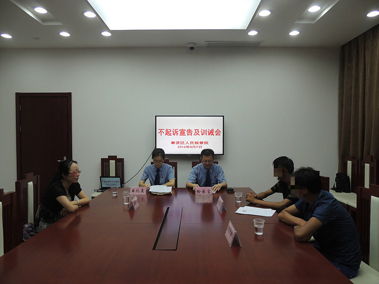 近日,奉贤区检察院对一名涉嫌盗窃的未成年人范某作出不起诉决定,并进行司法化宣告。该院未检部门检察官宣读了不起诉决定书和训诫词,范某的辩护人和亲属也分别对其进行了教育,范某表示会珍惜这次来之不易的机会,今后认真学习、努力工作,靠自己的双手挣钱来孝敬父母,做一个遵纪守法的好公民。