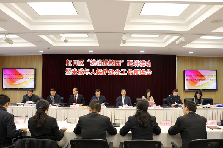 未检处处长吴燕,市教委青保处处长朱坚,虹口分局指挥处处长金晓林等领导出席。区“法治进校园”巡讲活动基地学校校长和政教主任、首批区“法治进校园”巡讲团成员以及未检科全体干警、区院法制宣讲团成员参加会议。