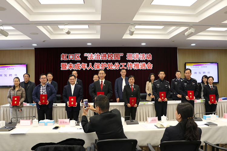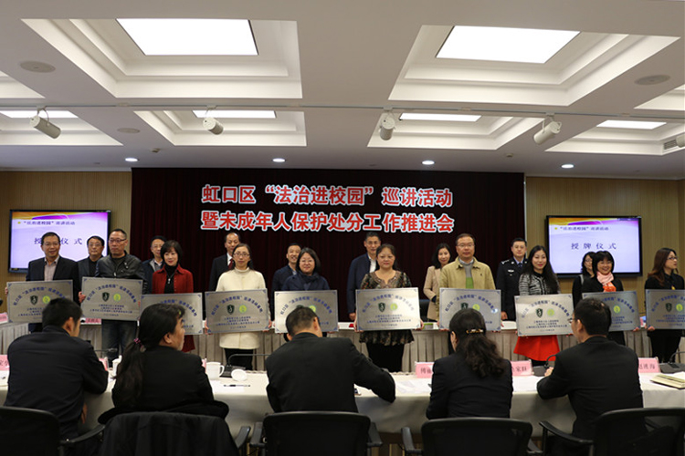 会上解读了《虹口区“法治进校园”巡讲活动实施方案》、《关于建立未成年人保护处分制度的实施意见》。与会领导向10所巡讲活动基地学校的代表授牌,以及向首批来自公检法司社的9名区“法治进校园”巡讲员颁发聘书。之后,区检察院、区公安分局和区教育局领导就联合制定的《关于建立未成年人保护处分制度的实施意见》进行了签约。