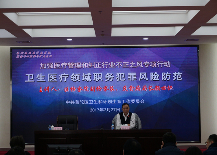 近日,普陀区检察院副检察长颜世征应邀为区卫计委党政班子领导及系统各单位200余名领导班子、关键岗位人员作《卫生医疗领域职务犯罪风险防范》的廉政报告。