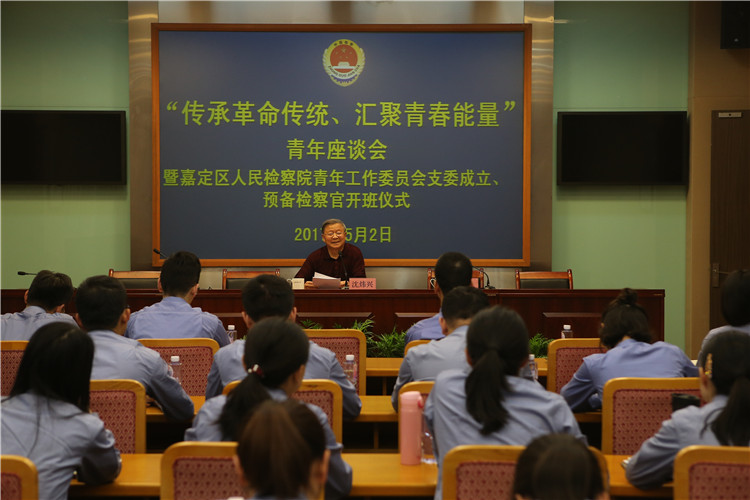 在嘉定区检察院,青年干警占了全院人数的三分之二,如何为年轻人的成长提供平台和支持?如何通过良性竞争和选拔机制使优秀人才脱颖而出?为搭建青年干警成长平台,充实检察官后备人才队伍,今年3月,该院出台了《关于探索建立预备检察官制度的实施办法(试行)》全市率先开展预备检察官实训活动。日前,嘉定区检察院召开青年座谈会,宣布该院青年工作委员会支委成立、同时举行预备检察官开班仪式,邀请了退休的原党组成员、副检察长沈炜兴为青年干警上了实训活动开展后的第一堂课。