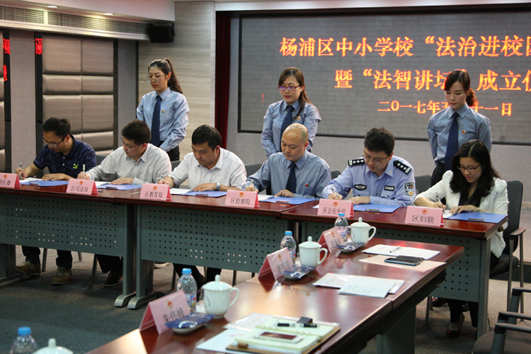 杨浦区检察院、区教育局、公安分局、司法局、妇联、团区委会签了《关于成立杨浦区中小学校“法智讲坛”的实施意见》,共同组建一支集刑事、民事、心理、教育等为一体的巡讲队伍。“法智讲坛”将针对不同年龄阶段学生的身心特点确定巡讲主题,并通过创新活动形式,延伸巡讲效果。