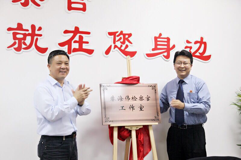 日前,金山区检察院“朱海伟检察官工作室”揭牌仪式在金山工业区检察室举行。金山区委常委、政法委书记沈金龙和金山区检察院检察长陶建平共同为工作室揭牌。