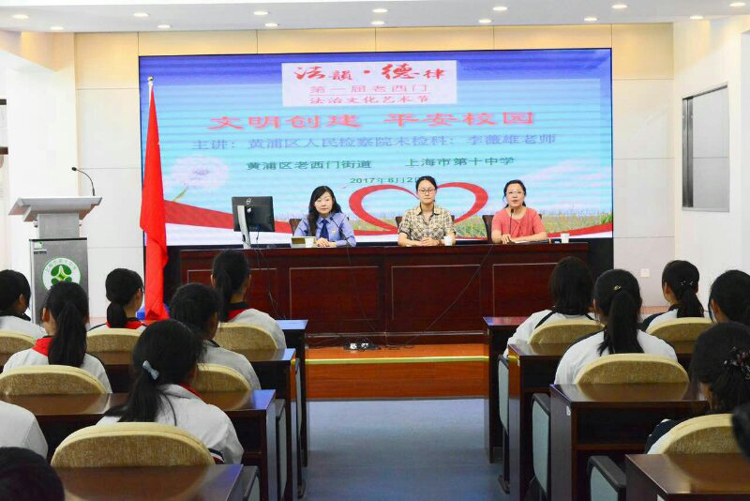 近日,黄浦区检察院未检科与社区检察科携手参与第一届老西门法治文化节活动。其中“法治进校园活动”作为文化节的内容之一,走进了市十中学的讲堂。检察官以“平安校园”为主题,结合校园欺凌案例,为全校师生开展了一场生动的法治宣传教育讲座,敲响校园安全警钟的同时,积极呼吁学生提高法律意识,加强自我保护能力。