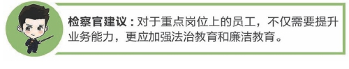 检察官建议,对于重点岗位上的员工,不仅需要提升业务能力,更应加强法治教育和廉洁教育,防止员工利用管理漏洞损害公司利益,因此建议该公司建立定期轮岗及突击检查机制等,防止员工长时间在同一岗位上可能产生的贪腐问题。