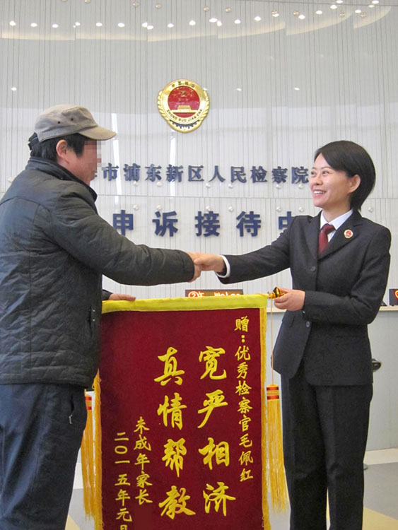 1月26日一大早,赶着来参加儿子小张相对不起诉公开宣告会的老张,郑重地将一面锦旗交给浦东新区检察院的检察官,感谢检察官给儿子小张一个改过自新的机会。据悉,这是该院长期以来践行司法为民的一个缩影。