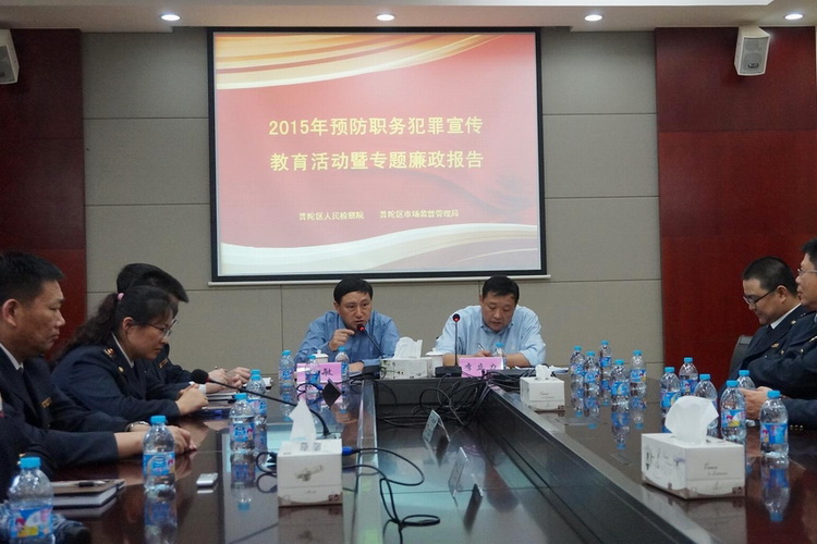 近日,普陀区检察院石泉检察室在区市场监督管理局监察科的大力配合下,在辖区内甘泉、宜川和石泉等三家市场监督管理所开展了预防职务犯罪宣传教育活动。该院副检察长唐敏前往甘泉街道会场进行专题廉政报告,60多名基层执法人员参与。