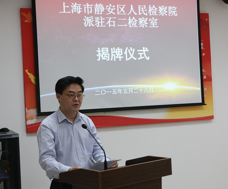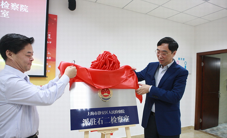 党组成员、政治部主任徐金贵,静安区委常委、政法委书记凌惠康共同为石二检察室揭牌。