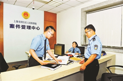 上海闵行区检察院案件受理中心正在接收公安机关移交的案件材料