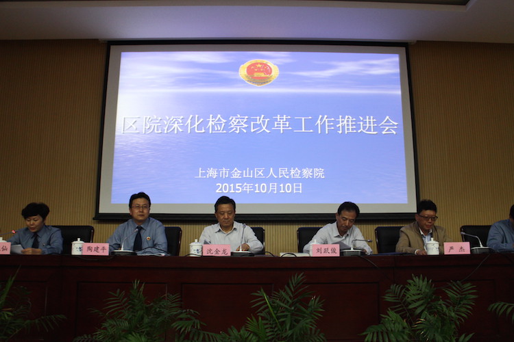 近日,金山区检察院召开深化检察改革工作推进会。区委常委、政法委书记沈金龙,区人大常委会副主任刘跃俊,区人大内司工委主任严杰,参与评议检察改革的社会人士代表及区院全体干警出席会议。