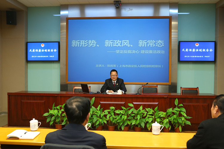 为加大廉政文化传播力度,增强党政干部的反腐倡廉意识,近日,嘉定区检察院检察长阮祝军为区人大工作研究会、工会研究会的党员干部作了反腐倡廉法制报告。
