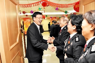 团拜联欢会开始前,曹建明来到大家中间,和大家亲切握手,互致新春的问候和祝愿。随后,他发表了热情洋溢的致辞。他首先代表最高人民检察院,向一年来辛勤工作、努力奉献的全国检察机关广大检察人员及其家属,向为检察事业倾注心血和汗水的离退休老领导、老同志,致以节日的问候和新春的祝福。
