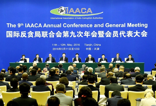5月11日,国际反贪局联合会第九次年会暨会员代表大会在天津开幕。中共中央政治局委员、中央政法委书记孟建柱出席开幕式并致辞。郝帆摄