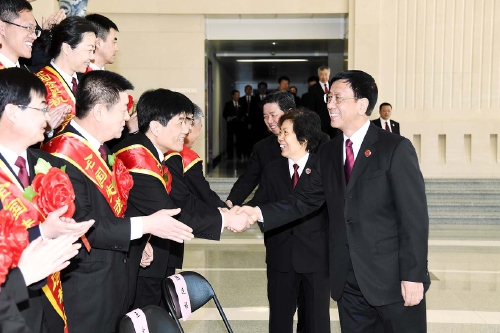 5月16日至17日,全国检察机关队伍建设工作会议暨第六届全国先进基层检察院表彰大会在北京召开,会议开始前最高人民检察院党组书记、检察长曹建明等领导接见与会代表。肖杰摄