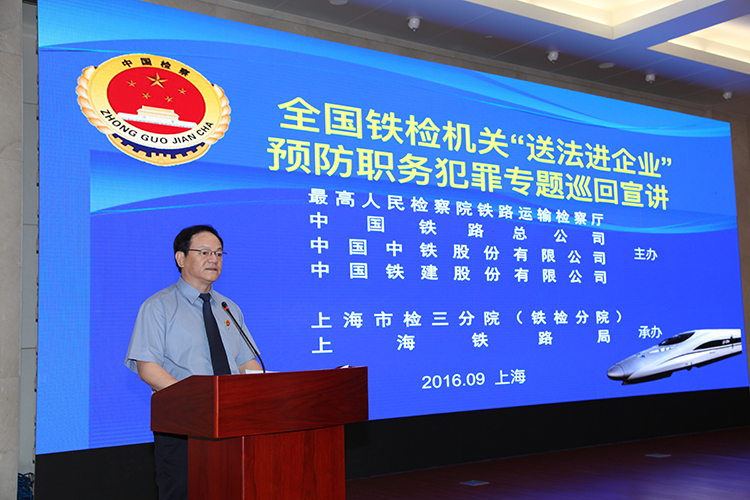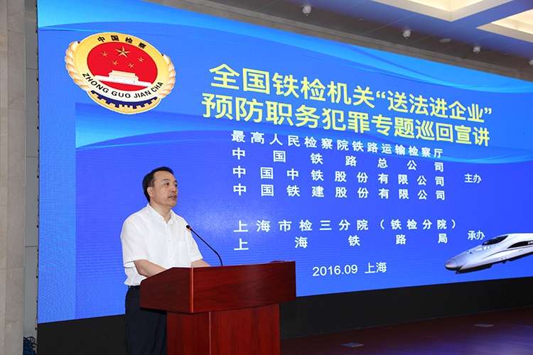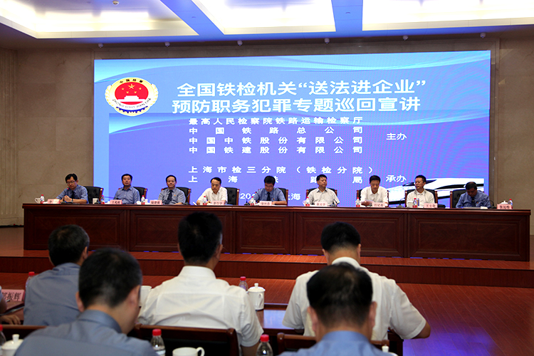 第三分院(铁检分院)和上海铁路局承办的全国铁检机关“送法进企业”预防职务犯罪专题巡回宣讲活动在上海铁路局举行。高检院铁检厅厅长徐向春,中国铁路总公司党组纪检组副组长蔡双亭,上海铁路局局长郭竹学,上海铁路局党委书记任纪善,三分院(铁检分院)党组书记、检察长陆建强等领导出席。上海铁路运输及建设单位干部职工200余人在主会场参加,上海铁路局局属单位中心组成员800余人通过电视电话视频收看宣讲。