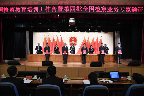 专家颁证仪式在京举行。最高人民检察院党组书记、检察长曹建明出席并讲话。他强调,各级检察机关要认真学习贯彻习近平总书记系列重要讲话特别是关于人才培养和政法队伍建设的重要指示精神,深入贯彻中央《关于新形势下加强政法队伍建设的意见》,把思想政治建设摆在首位,按照“五个过硬”要求和正规化专业化职业化方向,坚持以岗位素能基本标准为指引,以检察队伍素质能力建设为核心,以提升教育培训质量效益为主线,以深化检察教育培训改革为动力,以现代科技手段应用为支撑,全面落实大规模培训干部、大幅度提高干部素质战略任务,构建科学完善的检察教育培训体系和机制,建设一支信念坚定、司法为民、敢于担当、清正廉洁的检察队伍,为推动检察工作健康发展提供有力的人才支撑。