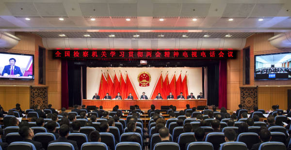 3月23日,最高人民检察院召开全国检察机关学习贯彻全国两会精神电视电话会议,最高人民检察院党组书记、检察长曹建明出席会议并讲话。程丁摄