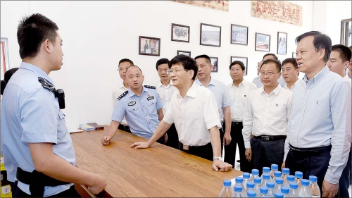 7月11日至12日,中共中央政治局委员、中央政法委书记孟建柱在贵州调研。图为孟建柱在丹寨县考察社区警务工作。郝帆摄