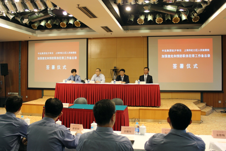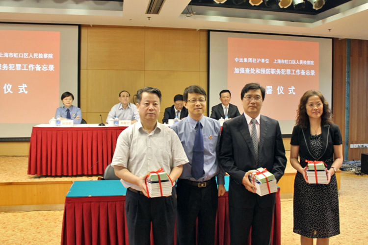 仪式上,虹口区检察院党组书记、检察长陈思群,中远集装箱运输有限公司党委书记高平代表双方签署备忘录。检察机关还向中远集团驻沪单位代表赠送了《以案释法——国企工作人员职务犯罪案例汇编》等预防书籍。
