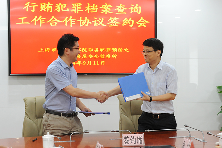 职务犯罪预防处与上海市房屋安全监察所签署《关于在上海市建构筑物拆除领域推进开展行贿犯罪档案查询工作的合作协议》,就本市建筑物、构筑物拆除领域推行行贿犯罪档案查询工作达成合作意向。