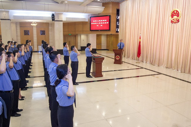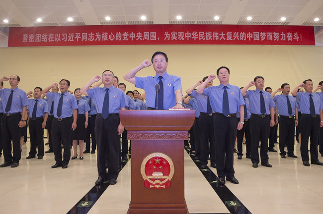 最高检党组副书记、副检察长邱学强主持宣誓仪式。奏唱国歌之后,张军监誓,最高检党组成员、副检察长童建明抚按宪法领誓,最高检机关新任职人员面对国旗国徽右手举拳庄严宣誓。宣誓后,张军发表了讲话。