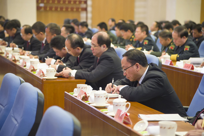 最高人民检察院干警在主会场认真聆听、记录报告。