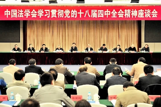 11月2日上午,中国法学会在京召开学习贯彻党的十八届四中全会精神座谈会。最高人民检察院党组书记、检察长曹建明出席会议并作了《深入学习十八届四中全会精神,积极投身全面推进依法治国伟大实践》的专题辅导报告。他在报告中指出,四中全会描绘了全面推进依法治国的新蓝图。全面推进依法治国需要理论和学理支撑,希望法学界充分发挥法学智库作用,推进法治理论创新,加强法治队伍建设,努力形成全面推进依法治国的强大动力。