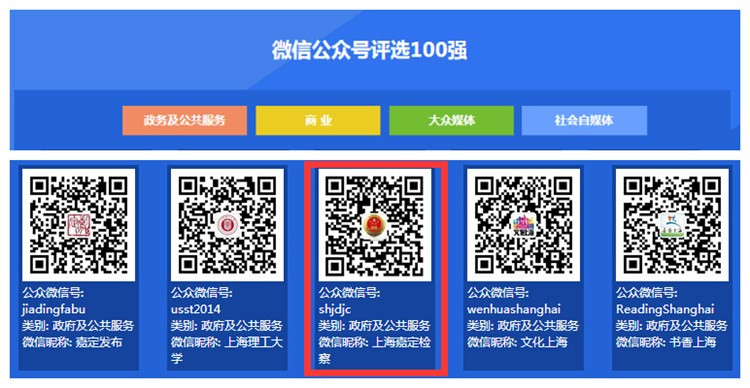 日前,由腾讯大申网、复旦数字与移动治理实验室等主办的“上海十大微信公众账号评选活动”海选100强名单公布,“上海嘉定检察”微信公众号入围政务自媒体100强。